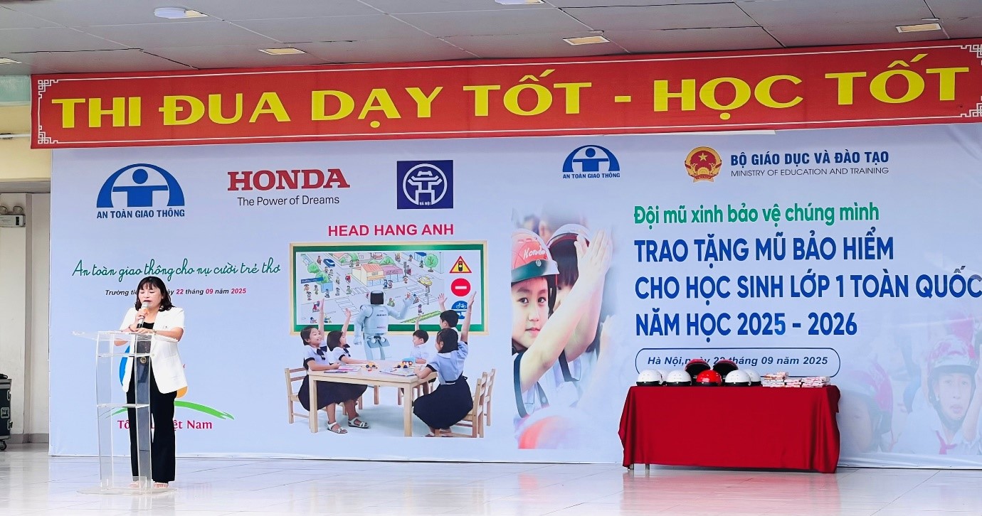 Tham gia chương trình. ông Trần Xuân Thức - đại diện Honda Hằng Anh (Đại lý do Honda ủy nhiệm) đã chia sẻ về việc thực hiện an toàn giao thông, cách đội mũ bảo hiểm đúng qui định và tặng quà cho thầy và trò nhà trường.