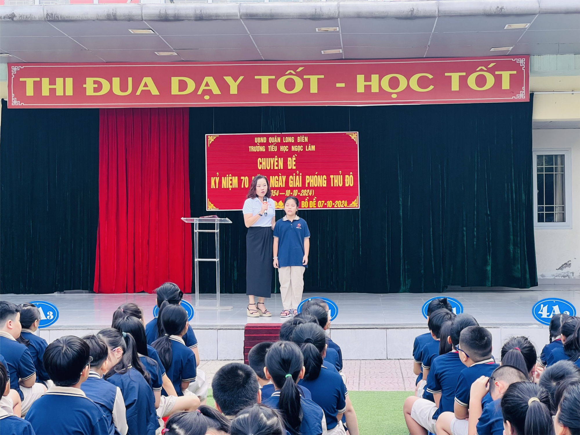 Sau nghi lễ chào cờ trang nghiêm, cô Nguyễn Thị Bích Huyền – Bí thư chi bộ, Hiệu trưởng nhà trường đã có bài nói chuyện truyền thống và cùng các em học sinh ôn lại sự kiện lịch sử trọng đại của dân tộc nhân kỉ niệm 70 năm Giải phóng Thủ đô (10/10/1954 – 10/10/2024).