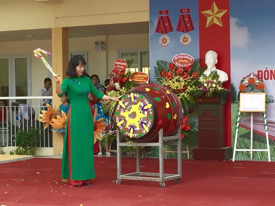 Cô giáo Hiệu trưởng đánh trống khai trường năm học 2018 – 2019 trong niềm hân hoan của cô và trò nhà trường với quyết tâm thi đua thầy dạy tốt trò học tốt ngày một bay cao,bay xa thành công rực rỡ.